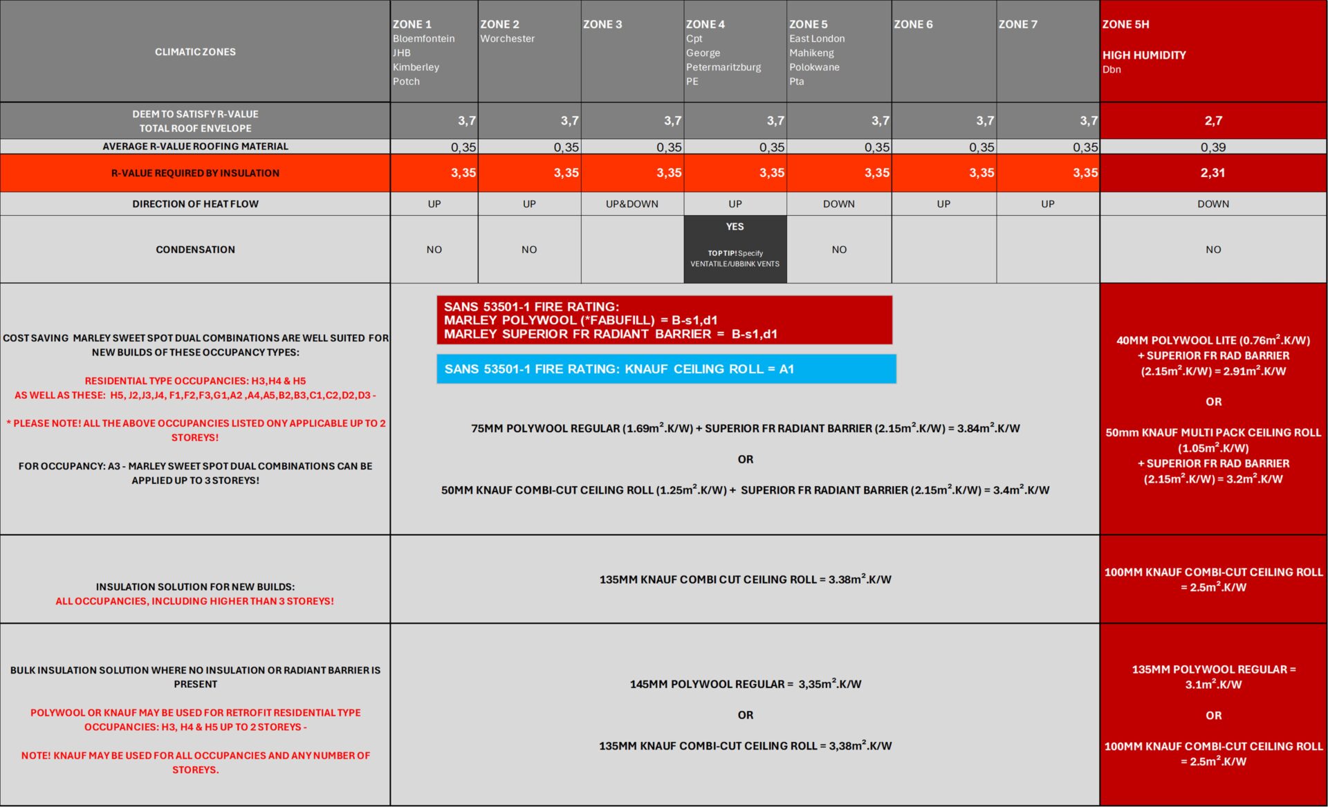 With our dual insulation system – using our Marley FR Superior Radiant barrier with B, s1,d1 fire rating and combining it with either Marley Polywool with B,s1,d1 fire rating (*registered as Fabufill) or KNAUF ceiling roll with A1 fire rating, you will be able to meet most residential type occupancies up to two stories high and save massive costs per square meter whilst achieving the ideal balance between blocking the heat in summer and keeping it in during the winter.